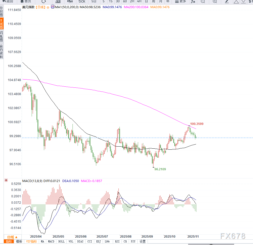汇通财经APP讯——美国政府正式重启后,美元指数(DXY)在周五亚洲时段维持于99.15附近震荡。尽管开盘表现略显坚挺,但整体仍偏向承压,因为市场普遍预期即将补发的大量经济数据可能揭示更深层次的经济放缓迹象。