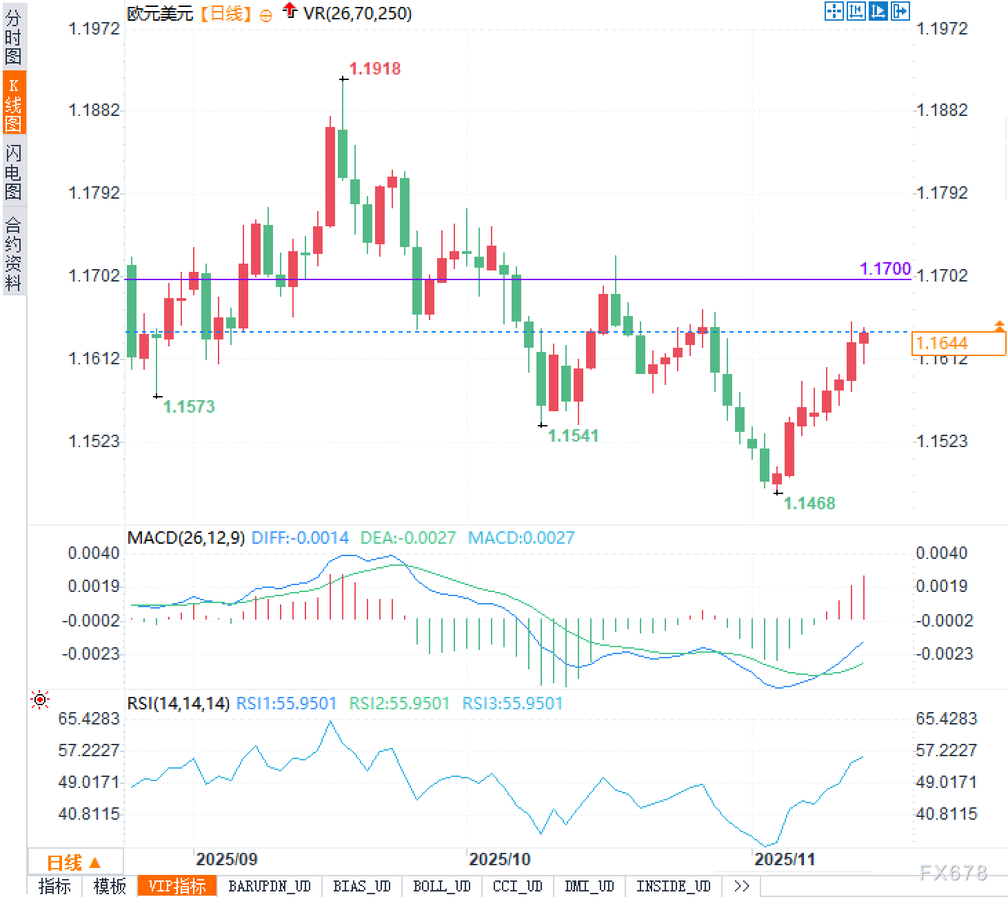 汇通财经APP讯——周五(11月14日),欧元兑美元汇价维持在震荡区间内,当前北美时段交投1.1650附近,略微上扬,接近前一日触及的三周高点1.1655。欧元区的GDP数据尽管显示经济增长仍显疲软,但在美元持续走弱的背景下,欧元表现强劲,市场情绪偏向于欧元多头。