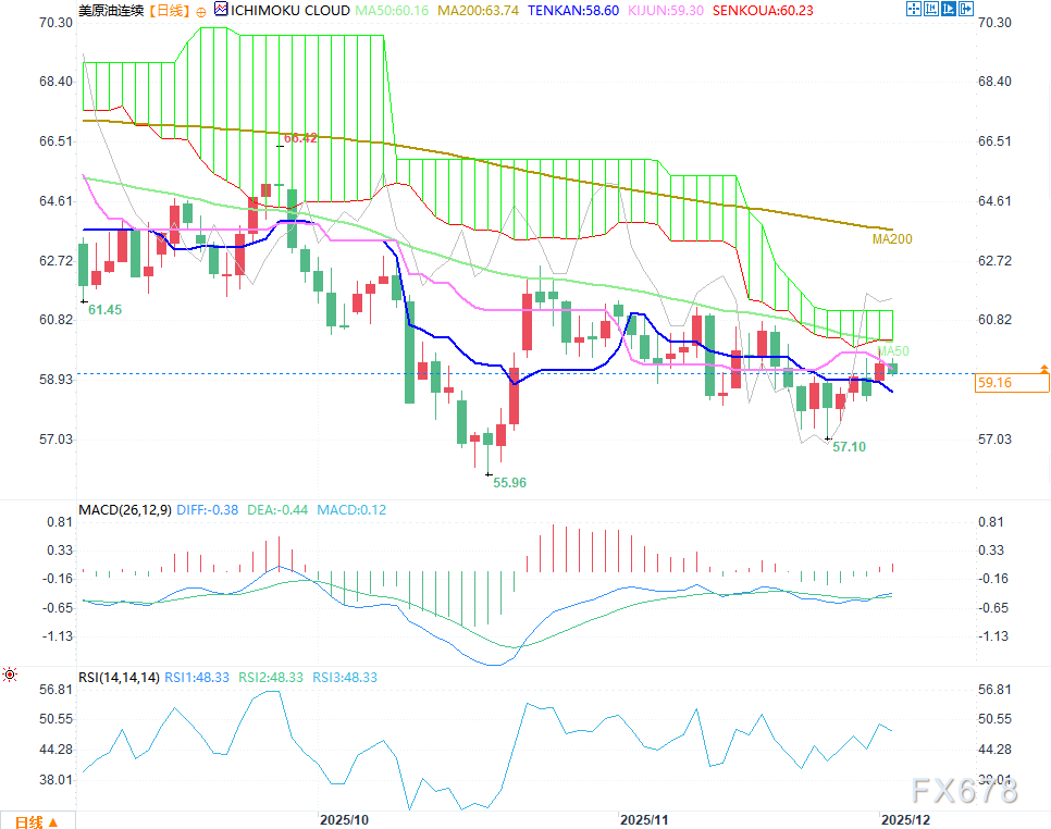 当前价格(59.18)处于57.10-59.64的低位震荡区间:下方支撑:57.10(近期震荡低点)、55.96(阶段新低);上方阻力:59.64(区间上沿)、62.59(前期反弹高点)。